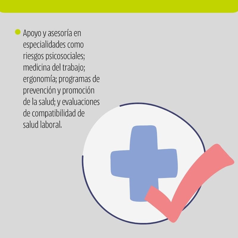 * Apoyo y asesoría en especialidades como riesgos psicosociales; medicina del trabajo; ergonomía; programas de prevención y promoción de la salud; y evaluaciones de compatibilidad de salud laboral.