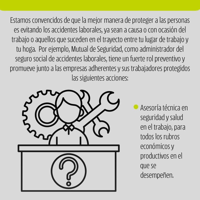Estamos convencidos de que la mejor manera de proteger a las personas es evitando los accidentes laborales, ya sean a causa o con ocasión del trabajo o aquellos que suceden en el trayecto entre tu lugar de trabajo y tu hogar. Por ejemplo, Mutual de Seguridad, como administrador del seguro social de accidentes laborales, tiene un fuerte rol preventivo y promueve junto a las empresas adherentes y sus trabajadores protegidos las siguientes acciones: