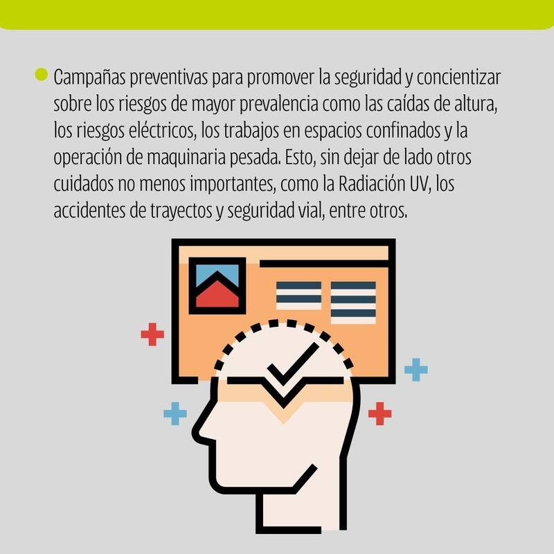 * Campañas preventivas para promover la seguridad y concientizar sobre los riesgos de mayor prevalencia como las caídas de altura, los riesgos eléctricos, los trabajos en espacios confinados y la operación de maquinaria pesada. Esto, sin dejar de lado otros cuidados no menos importantes, como la Radiación UV, los accidentes de trayectos y seguridad vial, entre otros.