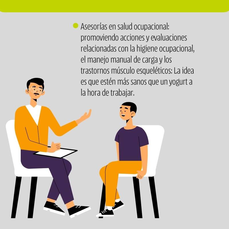 * Asesorías en salud ocupacional: promoviendo acciones y evaluaciones relacionadas con la higiene ocupacional, el manejo manual de carga y los trastornos músculo esqueléticos: La idea es que estén más sanos que un yogurt a la hora de trabajar.