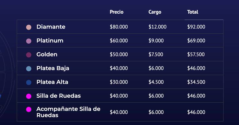 Los valores de los tickets van desde los $34.500 para el sector de tribuna, hasta los $92.000 para diamante (incluido el cargo por servicio).
