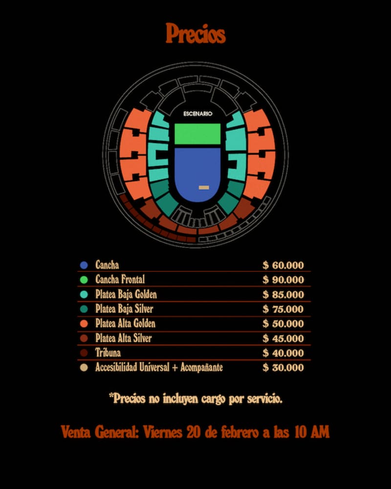Entradas: Disponibles a la venta desde las 10:00 del viernes 20 de febrero vía Puntoticket con precios que van desde los $30.000 a los $90.000.