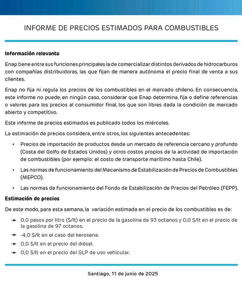 En este contexto de variación de valores, Enap destacó que “no fija ni regula los precios en el mercado chileno”, en donde se toma en consideración antecedentes de la importación de productos (Costa del Golfo de Estados Unidos), el funcionamiento del Mecanismo de Estabilización de Precios de Combustibles (MEPCO) y del Fondo de Estabilización de Precios del Petróleo (FEPP).