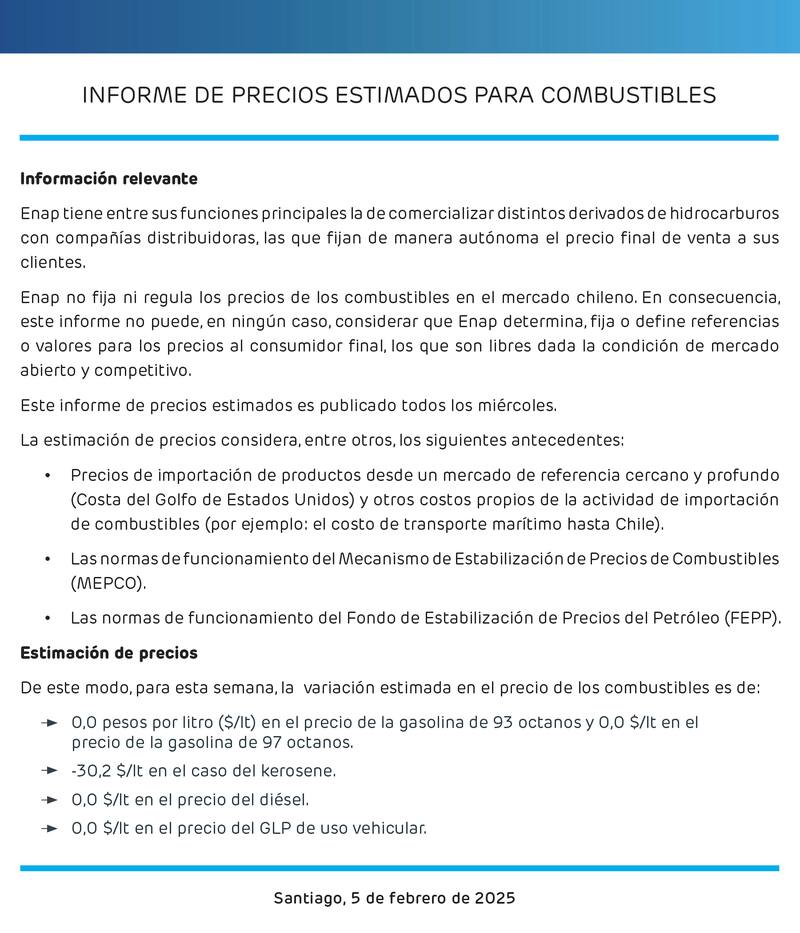 En este contexto de variación de valores, Enap destacó que “no fija ni regula los precios en el mercado chileno”, en donde se toma en consideración antecedentes de la importación de productos (Costa del Golfo de Estados Unidos), el funcionamiento del Mecanismo de Estabilización de Precios de Combustibles (MEPCO) y del Fondo de Estabilización de Precios del Petróleo (FEPP).