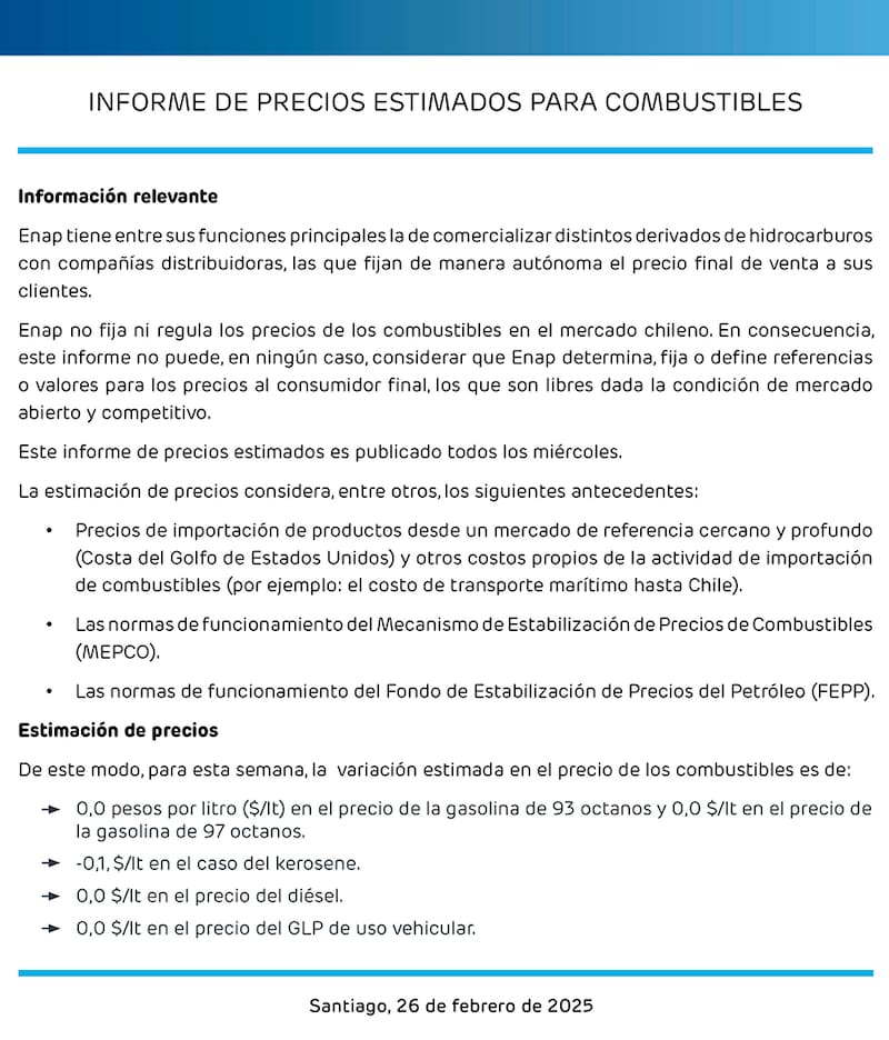 En este contexto de variación de valores, Enap destacó que “no fija ni regula los precios en el mercado chileno”, en donde se toma en consideración antecedentes de la importación de productos (Costa del Golfo de Estados Unidos), el funcionamiento del Mecanismo de Estabilización de Precios de Combustibles (MEPCO) y del Fondo de Estabilización de Precios del Petróleo (FEPP).