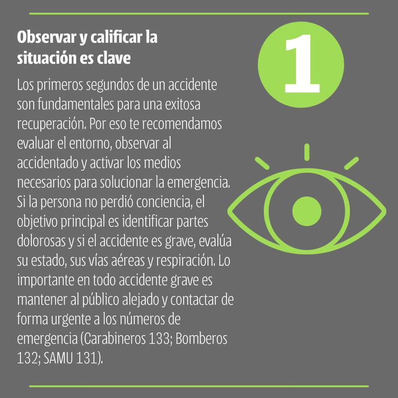 Los primeros segundos de un accidente son fundamentales para una exitosa recuperación. Por eso te recomendamos evaluar el entorno, observar al accidentado y activar los medios necesarios para solucionar la emergencia. Si la persona no perdió conciencia, el objetivo principal es identificar partes dolorosas y si el accidente es grave, evalúa su estado, sus vías aéreas y respiración. Lo importante en todo accidente grave es mantener al público alejado y contactar de forma urgente a los números de emergencia (Carabineros 133; Bomberos 132; SAMU 131).