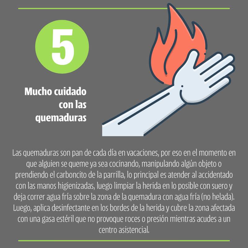Las quemaduras son pan de cada día en vacaciones, por eso en el momento en que alguien se queme ya sea cocinando, manipulando algún objeto o prendiendo el carboncito de la parrilla, lo principal es atender al accidentado con las manos higienizadas, luego limpiar la herida en lo posible con suero y deja correr agua fría sobre la zona de la quemadura con agua fría (no helada). Luego, aplica desinfectante en los bordes de la herida y cubre la zona afectada con una gasa estéril que no provoque roces o presión mientras acudes a un centro asistencial.