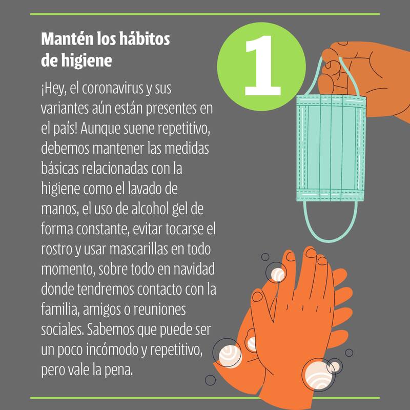 ¡Hey, el coronavirus y sus variantes aún están presentes en el país! Aunque suene repetitivo, debemos mantener las medidas básicas relacionadas con la higiene como el lavado de manos, el uso de alcohol gel de forma constante, evitar tocarse el rostro y usar mascarillas en todo momento, sobre todo en navidad donde tendremos contacto con la familia, amigos o reuniones sociales. Sabemos que puede ser un poco incómodo y repetitivo, pero vale la pena.