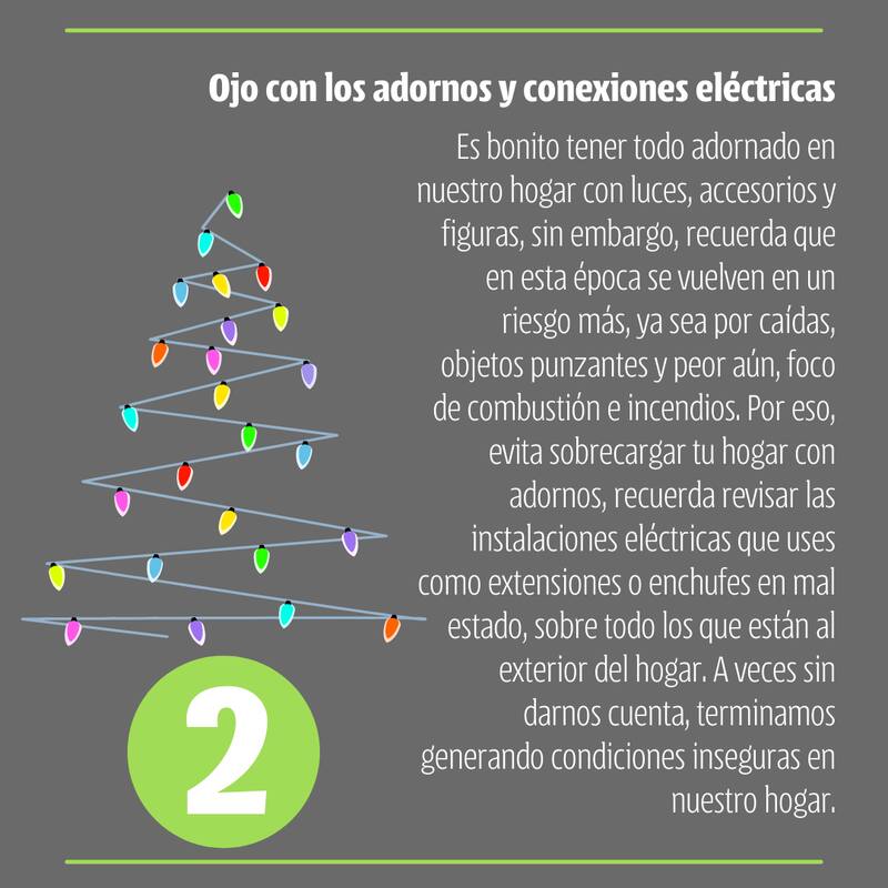 Es bonito tener todo adornado en nuestro hogar con luces, accesorios y figuras, sin embargo, recuerda que en esta época se vuelven en un riesgo más, ya sea por caídas, objetos punzantes y peor aún, foco de combustión e incendios. Por eso, evita sobrecargar tu hogar con adornos, recuerda revisar las instalaciones eléctricas que uses como extensiones o enchufes en mal estado, sobre todo los que están al exterior del hogar. A veces sin darnos cuenta, terminamos generando condiciones inseguras en nuestro hogar.