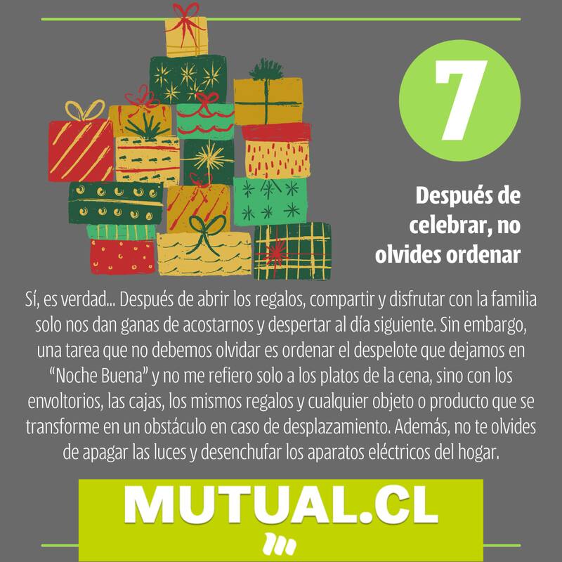 Sí, es verdad… Después de abrir los regalos, compartir y disfrutar con la familia solo nos dan ganas de acostarnos y despertar al día siguiente. Sin embargo, una tarea que no debemos olvidar es ordenar el despelote que dejamos en “Noche Buena” y no me refiero solo a los platos de la cena, sino con los envoltorios, las cajas, los mismos regalos y cualquier objeto o producto que se transforme en un obstáculo en caso de desplazamiento. Además, no te olvides de apagar las luces y desenchufar los aparatos eléctricos del hogar.