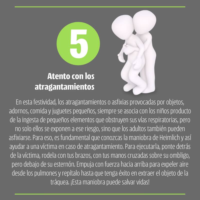 En esta festividad, los atragantamientos o asfixias provocadas por objetos, adornos, comida y juguetes pequeños, siempre se asocia con los niños producto de la ingesta de pequeños elementos que obstruyen sus vías respiratorias, pero no solo ellos se exponen a ese riesgo, sino que los adultos también pueden asfixiarse. Para eso, es fundamental que conozcas la maniobra de Heimlich y así ayudar a una víctima en caso de atragantamiento. Para ejecutarla, ponte detrás de la víctima, rodela con tus brazos, con tus manos cruzadas sobre su ombligo, pero debajo de su esternón. Empuja con fuerza hacia arriba para expeler aire desde los pulmones y repítalo hasta que tenga éxito en extraer el objeto de la tráquea. ¡Esta maniobra puede salvar vidas!