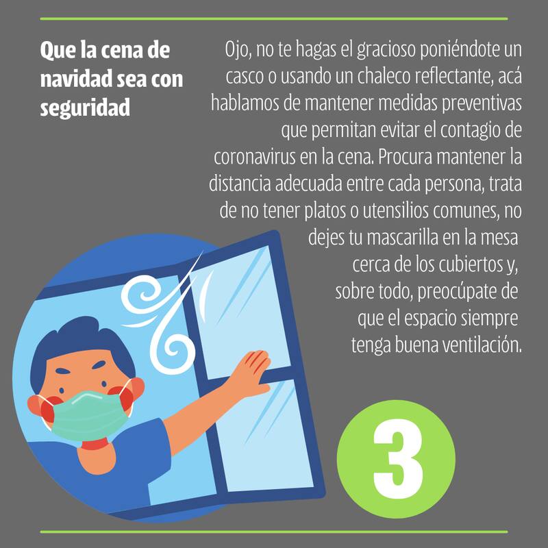 Ojo, no te hagas el gracioso poniéndote un casco o usando un chaleco reflectante, acá hablamos de mantener medidas preventivas que permitan evitar el contagio de coronavirus en la cena. Procura mantener la distancia adecuada entre cada persona, trata de no tener platos o utensilios comunes, no dejes tu mascarilla en la mesa cerca de los cubiertos y, sobre todo, preocúpate de que el espacio siempre tenga buena ventilación.
