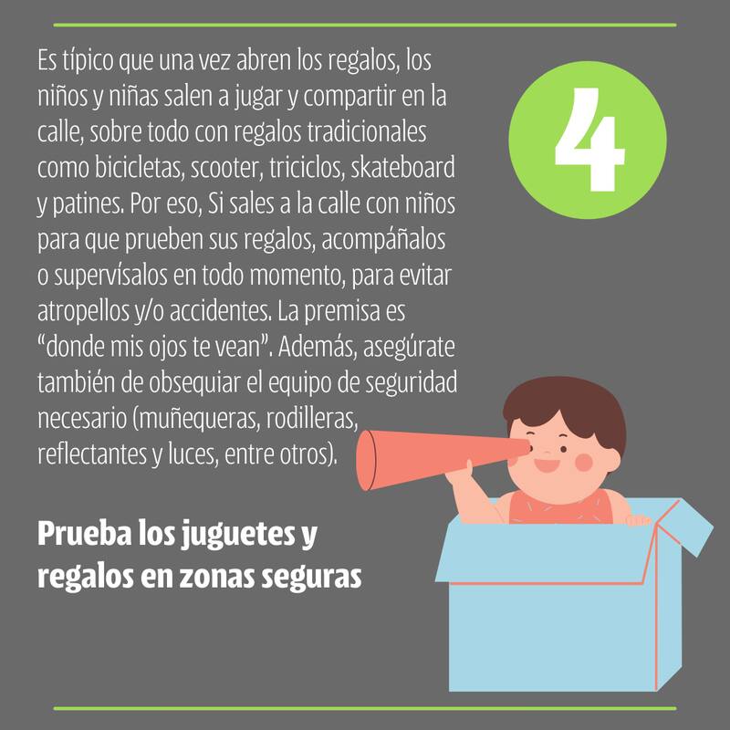 Es típico que una vez abren los regalos, los niños y niñas salen a jugar y compartir en la calle, sobre todo con regalos tradicionales como bicicletas, scooter, triciclos, skateboard y patines. Por eso, Si sales a la calle con niños para que prueben sus regalos, acompáñalos o supervísalos en todo momento, para evitar atropellos y/o accidentes. La premisa es “donde mis ojos te vean”. Además, asegúrate también de obsequiar el equipo de seguridad necesario (muñequeras, rodilleras, reflectantes y luces, entre otros).