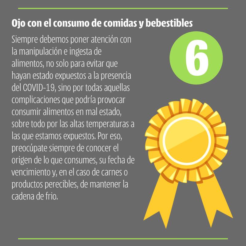Siempre debemos poner atención con la manipulación e ingesta de alimentos, no solo para evitar que hayan estado expuestos a la presencia del COVID-19, sino por todas aquellas complicaciones que podría provocar consumir alimentos en mal estado, sobre todo por las altas temperaturas a las que estamos expuestos. Por eso, preocúpate siempre de conocer el origen de lo que consumes, su fecha de vencimiento y, en el caso de carnes o productos perecibles, de mantener la cadena de frio.