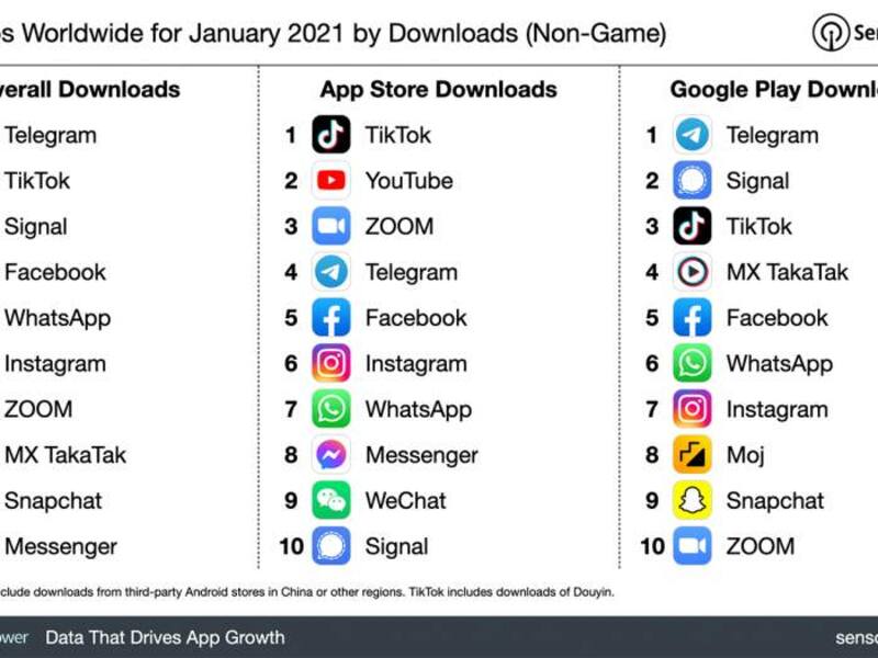 No solo eso, otra alternativa de mensajería, llamada Signal, se quedó con el tercer lugar, mientras que la exitosa TikTok se quedó con el segundo puesto.