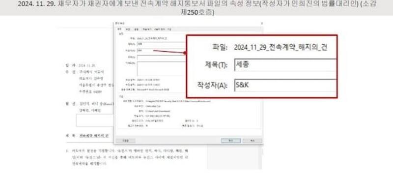 La empresa mostró documentos en los que se indicaba que el aviso de rescisión fue redactado por los representantes legales de Min Hee Jin. Los metadatos del archivo PDF, según ADOR, revelaron que la notificación había sido creada bajo la cuenta corporativa S&K, vinculada a la firma legal de Min Hee Jin.