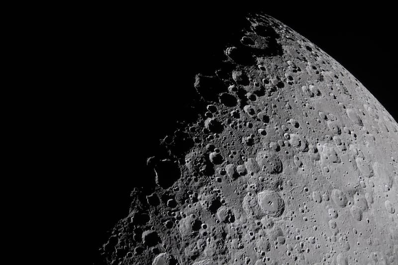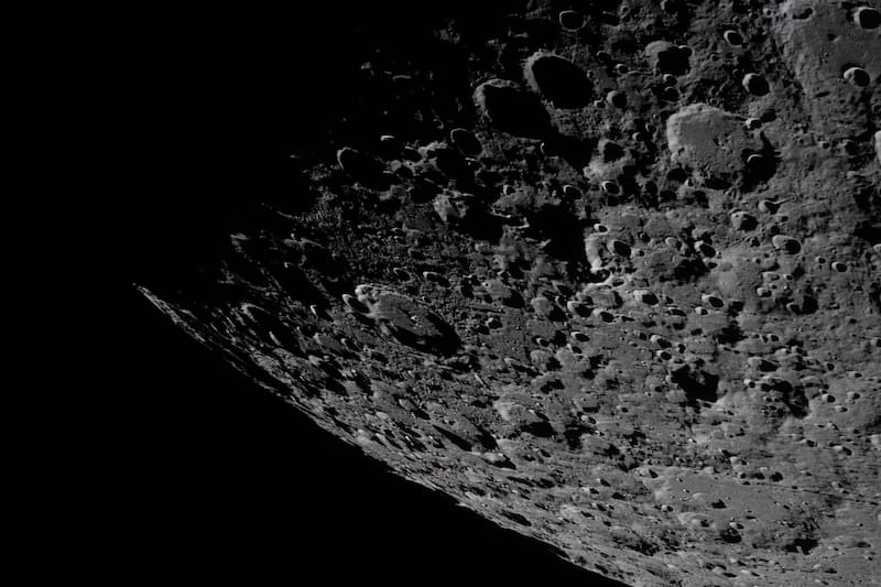 Formaciones de diversos cráteres destacan en estas condiciones, donde la interacción entre luz y sombra revela la complejidad del relieve lunar de una forma que no es visible bajo iluminación directa.