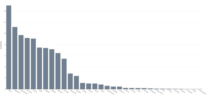 De acuerdo a su planteamiento, Brasil es el claro favorito con una probabilidad de ganar del 15%, seguido de Argentina con el 11,2%, Holanda con el 9,7%, Alemania con el 9,2%, y Francia con el 9,1%.