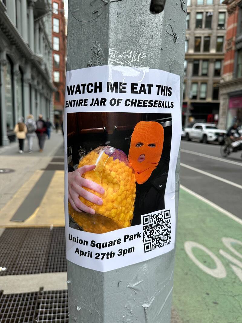 La semana pasada, las calles de Nueva York se vieron empapeladas de un misterioso mensaje pegado en los postes de la gran Manzana. “Mírame comer esta jarra entera de suflés” rezaba el panfleto que además contaba con la fotografía de un hombre enmascarado abrazando un gran frasco del clásico de los cumpleaños.