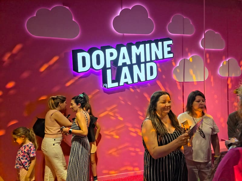 “La dopamina es una hormona y neurotransmisor que desempeña un papel crucial del sistema de recompensa del cerebro, generando sensaciones de placer, motivación y bienestar”. Con esa frase, explicando un poco que es lo que estaremos a punto de vivir te recibe Dopamine Land, una nueva experiencia en vivo que abrió sus puertas en el piso -1 de Cenco Costanera de la mano de Fever.