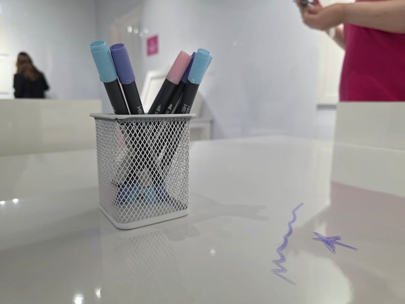 Grafitología es algo más interesante ya que se trata de un cuarto totalmente blanco, en el cual ponen a disposición del público una serie de plumones para poder pintar toda la superficie con lo que uno quiera: mensajes, dibujos, rayones, etc. Quizás lo que me falló fue que los colores de los plumones que había ese día eran muy pasteles, quizás es parte de la propuesta, pero cosas más chillonas habrían estado muy bien.
