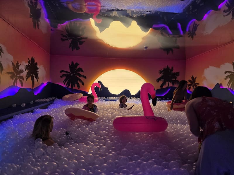 Después de ese shock de energía, llega un salón mucho más relajado, que luego se convertirá en la tónica de la experiencia: el espacio está armado de tal manera de que después de una experiencia activa, llegue una más tranquila. Por ejemplo, después de la Batalla de Almohadas está la Laguna del Atardecer, un espacio precisamente iluminado con la luz ténue del atardecer, el cual puede disfutarse en una piscina de pelotas de plástico con flotadores y música relajante.