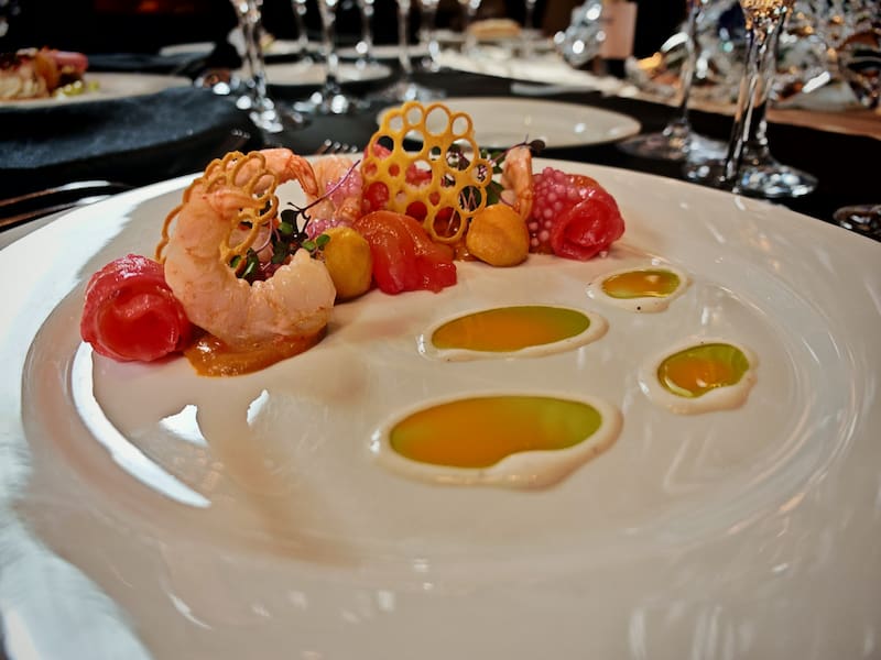 Luego hay un segundo tiempo, que consiste en un salmón marinado en remolacha acompañado de un camarón en mantequilla avellanada.