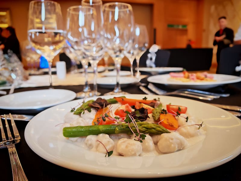 Como se trata de una fiesta abierta para toda la familia, el evento ofrece también un menú vegano, en el que cambian algunos de los platos ofrecidos. Por ejemplo, incluye un carpaccio de hongos silvestres con vinagreta trufada y brotes frescos y, como plato principal, ñoquis con vegetales confitados.