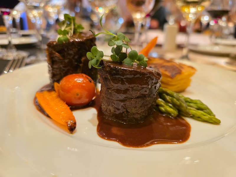 Y luego el plato de fondo: una preparación de Wagyu braseado a baja temperatura, acompañado de un mil hojas de papas trufadas y un demi-glace de chocolate bitter.