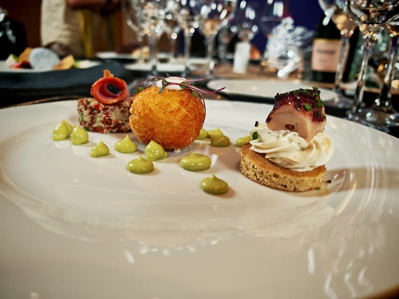 El menú principal consta de un aperitivo que trae un bocadito de pulpo ahumado, queso crema y eneldo, arancine de risotto en panko con carne de jaiba y pastrami con miel, quinua andina y tártara de ají verde.