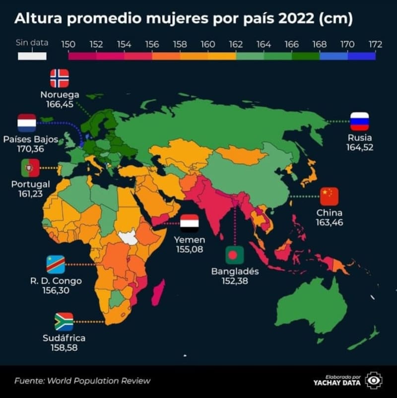 Automáticamente si se piensa en mujeres altas, se vienen a la mente personas de países europeos. Yachay Data comprobó esa teoría y escribió: “Los países con mujeres más altas se concentran en Europa, allí se encuentran las mujeres ‘más altas del mundo’ con 170,36 cm en promedio, específicamente en Países Bajos. Le siguen Montenegro con 169,96 cm y Dinamarca con 169,47 cm”.