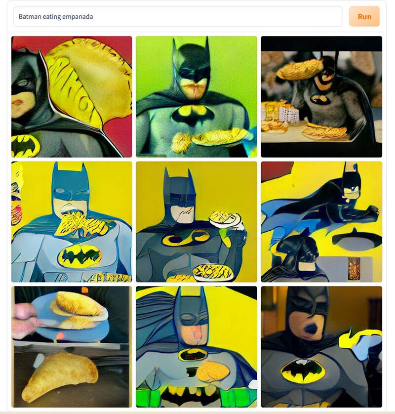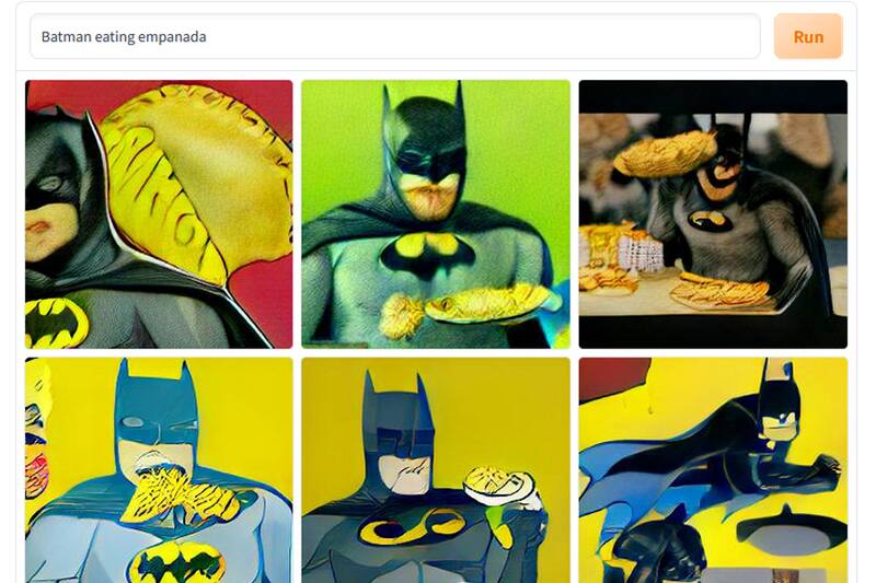 Puedes realizar tus pruebas (utilizando textos en ingles) en el portal Huggingface.co/spaces/dalle-mini/dalle-mini. Tengan en cuenta que el sitio está colapsado, pero tras algunos intentos pueden crear algo como lo que hicimos aquí en la redacción de La Cuarta: un Batman comiendo empanada.