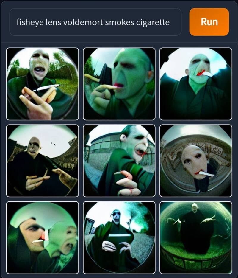 Voldemort fumando un cigarrillo en un lente de ojo de pez