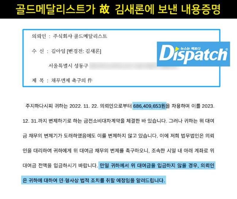 Luego de la inesperada muerte de la actriz Tras esto, Dispatch volvió a contactar a Gold Medalist sobre el tema de la deuda de Kim Sae Ron.