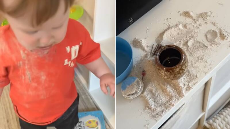 Natasha había subido a guardar ropa cuando, al regresar al living, encontró a su hijo paseando inocentemente por la habitación, cubierto de polvo grisáceo en la cara, la ropa y el sofá.