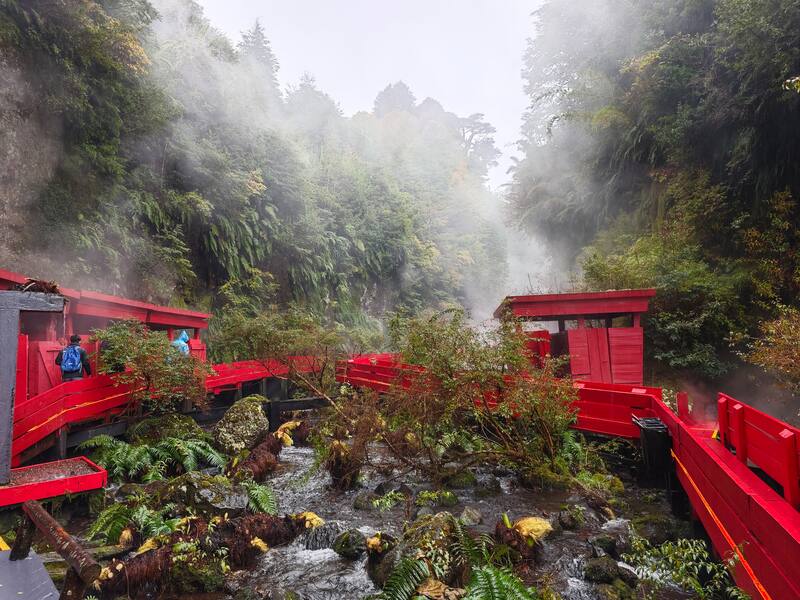 Luego fue el turno de ir a las Termas Geométricas, donde si bien el teléfono tiene certificación IP68 para resistir contra el agua, no me atreví a ver si además soportaba los efectos de calor y los minerales. Aun faltaban dos días de viaje. Pero por suerte el lugar tenía unos puentes rojos que hacían gran contraste con el verde natural.