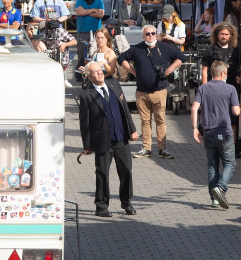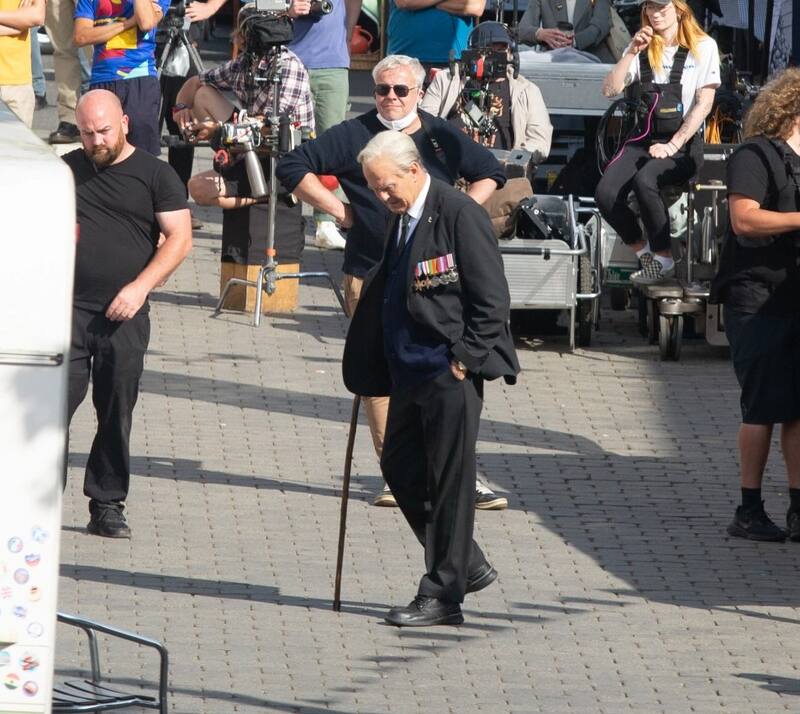 Además, camina acompañado de un bastón y viste un traje oscuro de tres piezas con chaleco de lana azul marino y medallas de guerra en la chaqueta.