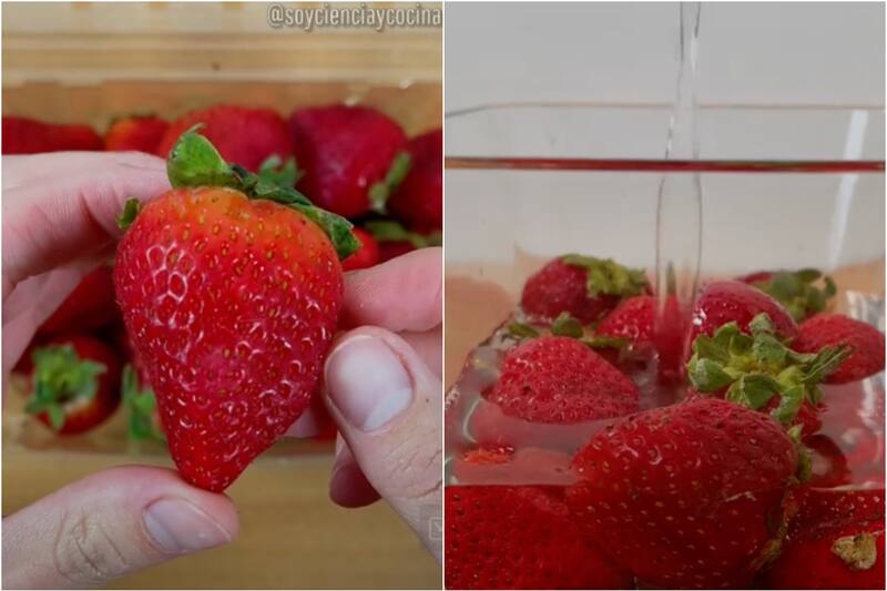 “Hay muchos videos virales mostrando esto, ¿pero es realmente cierto? Hagamos el experimento”, dijo el chef, quien puso a reposar frutillas en agua con sal durante un tiempo para ver si los insectos realmente aparecían.