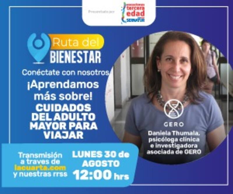 El espacio será conducido por Michael Roldán y conversaremos con la psicóloga clínica e investigadora asociada de GERO, Daniela Thumala, quien responderá algunas preguntas de los adultos mayores. La profesional explicará la importancia de viajar a esa edad, siempre teniendo presente el cuidado personal en estos tiempos. Ya lo sabes, este lunes a partir de las 12 horas a través de LaCuarta.com