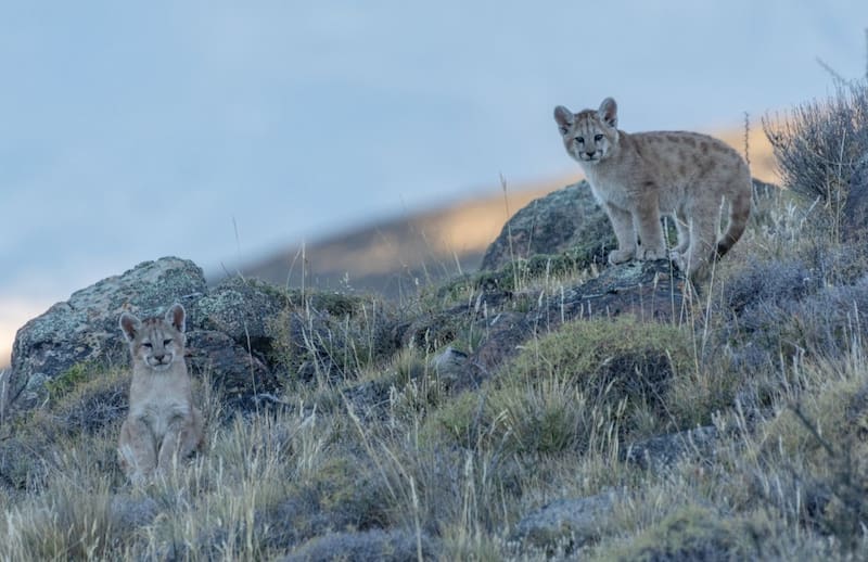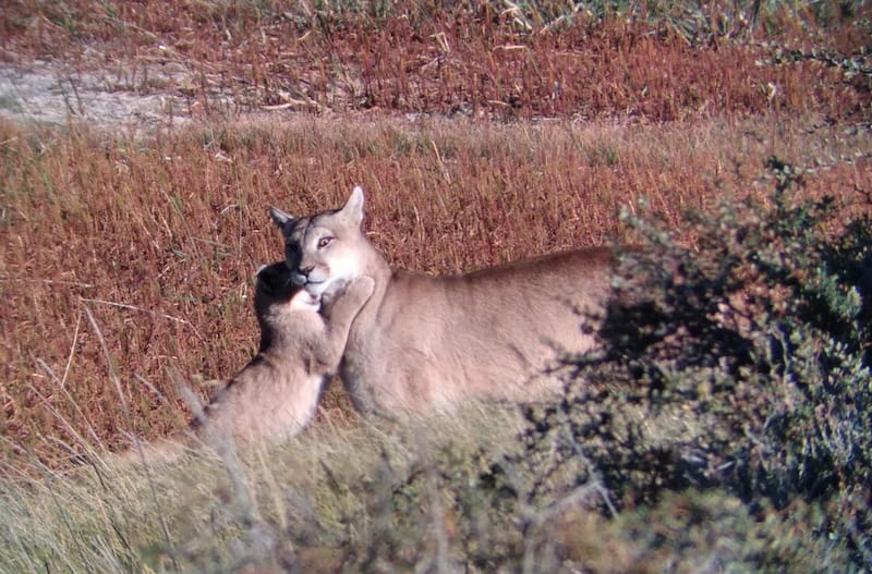 Los nenes corretean mientras la puma, sentada, patrulla el entorno. Uno de los cachorros pasa justo delante suyo y ella aprovecha de darle una suave lamida en la nuca. Ante la escena, recuerdo una frase de la zoóloga chilena Isabel Behncke: “No hay mamífero que no sea mamón”.