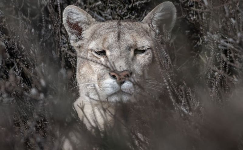 A pocos metros del ventoso lago Sarmiento, y a tan solo un par de metros del camino asfaltado, sobre unos opacos matorrales, otra joven puma reposa mientras avanza el mediodía.