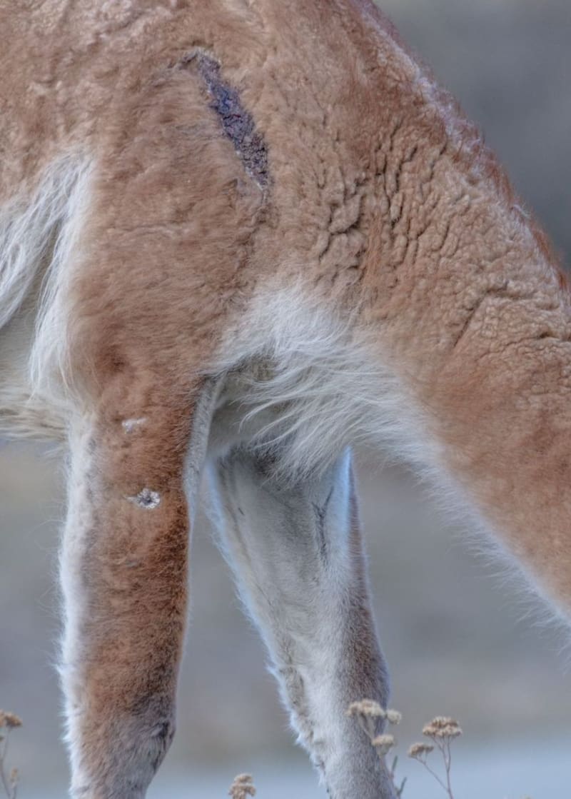 Otros guanacos, solitarios o en grupo, se alimentan con relativa paz. Una hembra, sola, come algunos verdes brotes. Adelante, en una de sus patas delanteras, una negra cicatriz salta a la vista. En su pelaje, profundos rasguños relatan una lucha pasada. Marcas de garras clavadas… ¿o colmillos? A un costado de su boca, una protuberancia se levanta como una sutura improvisada.