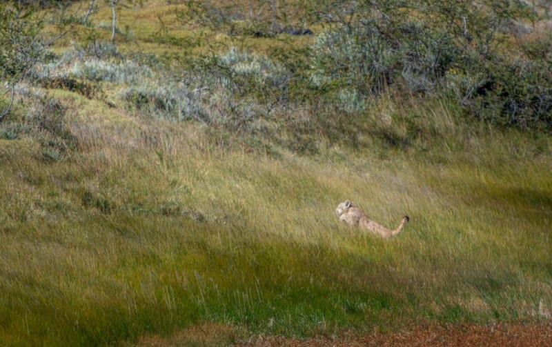 Avanzamos con cuidado hacia allá y, de pronto, se ve un puma subiendo una colina tras haber dejado atrás el camino. Dos guanacos relinchan alarmados ante su presencia, pero el depredador solo avanza, no tiene sentido perseguirlos si ya lo ojearon.