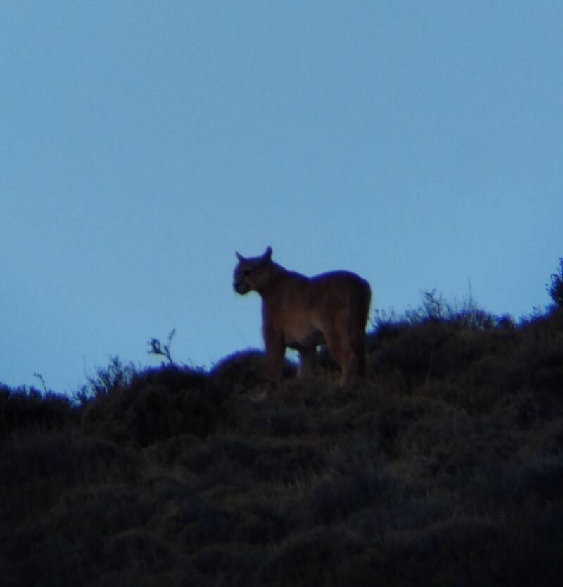 Ya con el cielo gris, casi oscuro, repentinamente una puma salta una barrera de contención, aterriza en el camino de ripio y cruza frente a nosotros. Empieza a subir una colina, aunque antes se toma un momento para observarnos. Es la misma que vimos el día anterior bajo una alta cueva de piedra, comenta el guía de ISO100.