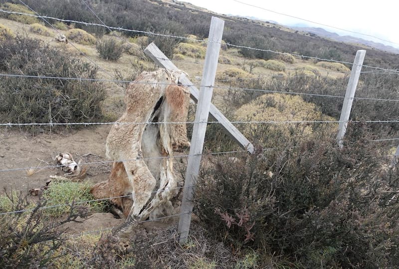 Por toda la estepa, se ven restos de guanaco. A veces uno que otro hueso como vértebras o fémures, pero también esqueletos completos con piel incluida, que pasan meses ahí conservados por el frío. En un momento, incluso, nos encontramos con lo que quedó de uno de estos camélidos que intentó saltar la cerca que un ganadero hizo más alta para evitar que crucen los animales, quedándose atrapado y cayendo de cabeza contra el suelo...
