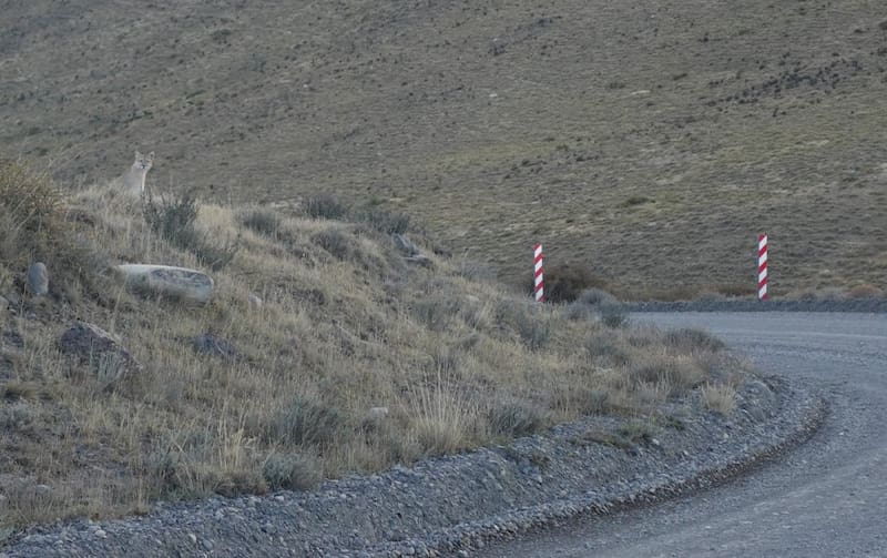En un momento, tras tres horas, decide levantarse. Cruza el camino en que, por suerte, no aparece ningún vehículo inesperado. Pasa justo detrás de un letrero que advierte no superar los 30 kms/hr. Como es costumbre en el máximo depredador de la Patagonia, sus pasos son firmes y relajados. Soberbia, avanza por entre los duros y espinosos matorrales de estepa, curtidos por los gélidos vientos.