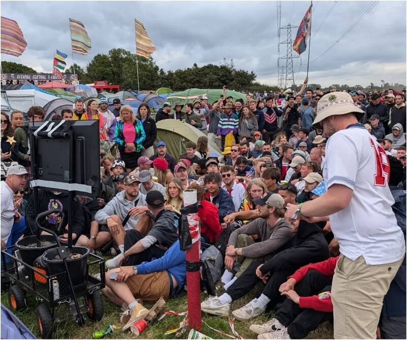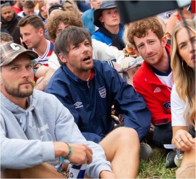 El intérprete sorprendió a todos por llevar a la zona de camping del festival un televisor para ver el partido entre Inglaterra y Eslovaquia por la Eurocopa. Estaba acompañado de algunos amigos y su hermana Lottie.