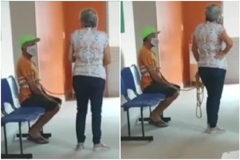 En la imagen se aprecia a su esposo amarrado con una cuerda a la cintura, la que era llevada por la mujer mientras ambos esperaban en el recinto asistencial su turno para poder vacunarse. El registro se hizo viral cuando un testigo de la situación decidió grabar un video y subirlo a la plataforma TikTok.
