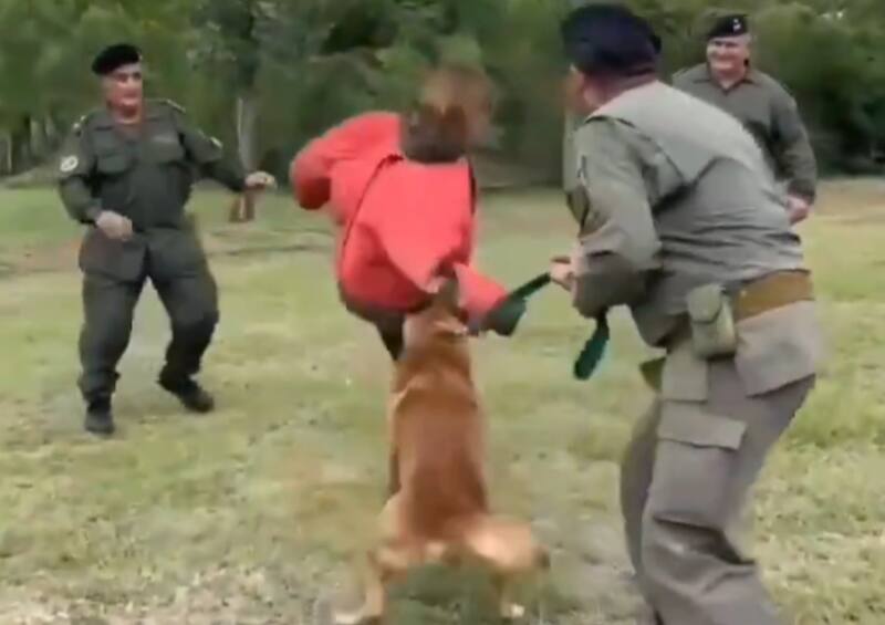 Vestida con un traje especial rojo que la protegería de las mordidas, el instructor indicó al can de seguridad que la atacara. El registro se viralizó en las redes sociales.