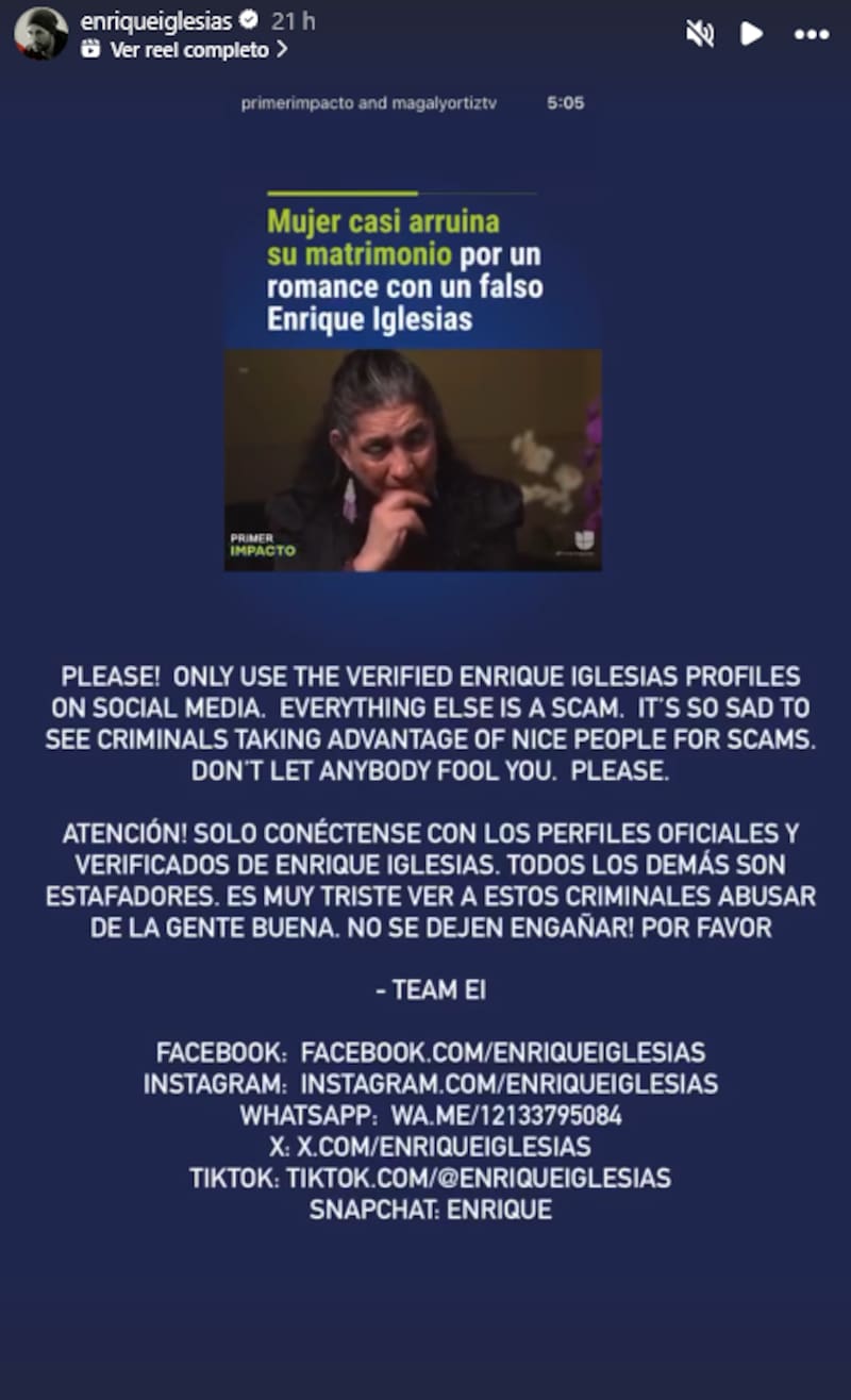 “Solo conéctense con los perfiles oficiales y verificados de Enrique Iglesias. Todos los demás son estafadores. Es muy triste ver a estos criminales abusar de la gente buena. No se dejen engañar, por favor”, expresó su equipo.